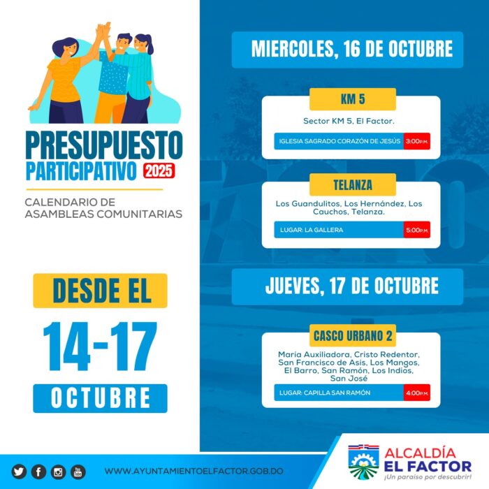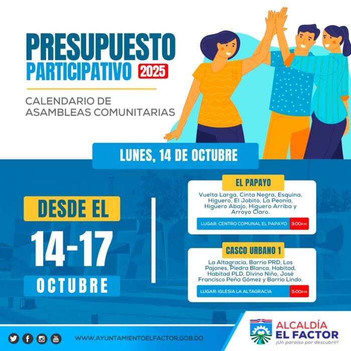 El Factor, María Trinidad Sánchez. – La Alcaldía de El Factor, en cumplimiento de la Ley 176-07 sobre el Distrito Nacional y los Municipios, convocó a toda la ciudadanía a participar en las reuniones comunitarias que se llevarán a cabo con el objetivo de elaborar el Presupuesto Participativo 2025.