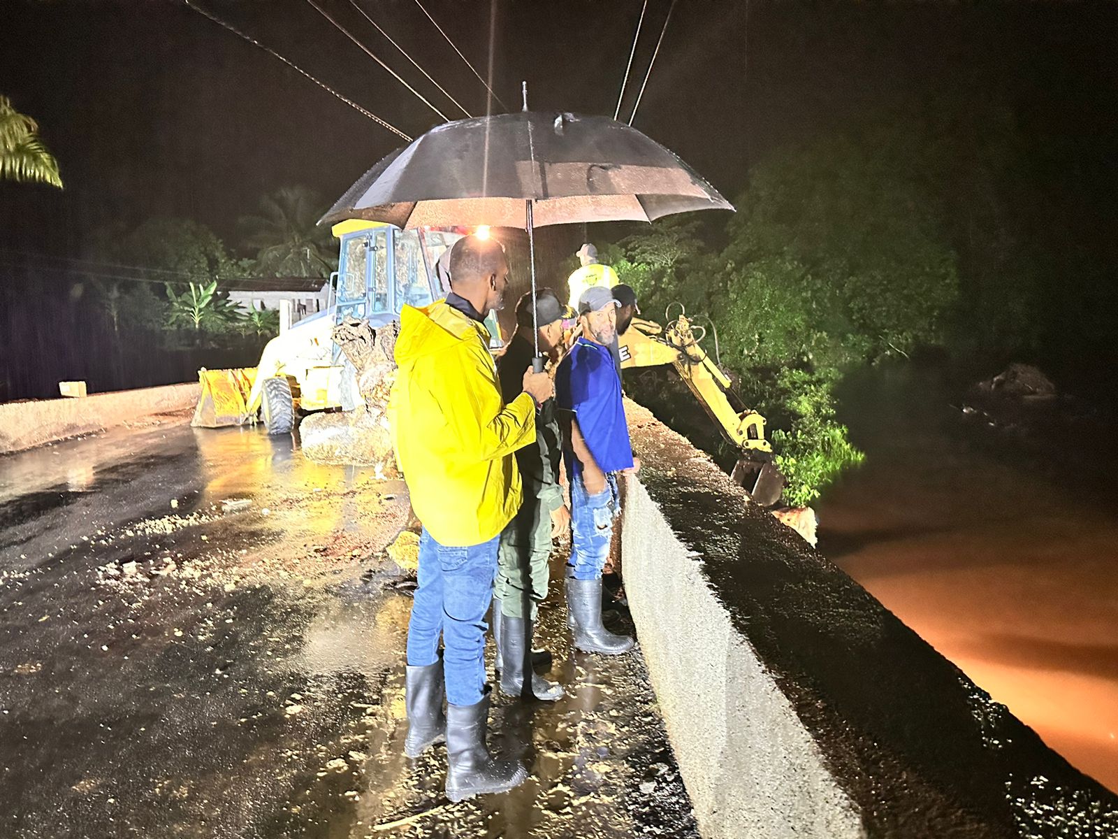 Durante el día, el alcalde supervisó labores en el puente de la comunidad de El Barro y, en horas de la noche, se trasladó al puente de La Pionia, donde, debido a la fuerza del río, se han acumulado grandes cantidades de basura, escombros y troncos de árboles.